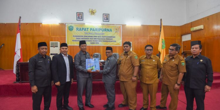 Pimpinan DPRD Kota Padangsidimpuan menerima Program pembentukan Peraturan Daerah (Propemperda) tahun 2024 dari Penjabat Wali Kota Padangsidimpuan Dr. H. Letnan Dalimunthe, S.K.M, M.Kes, di Aula Rapat Paripurna Jalan Sudirman Kecamatan Padangsidimpuan Utara, Selasa (21/11/2023).